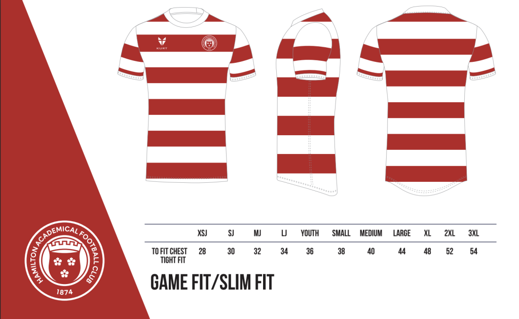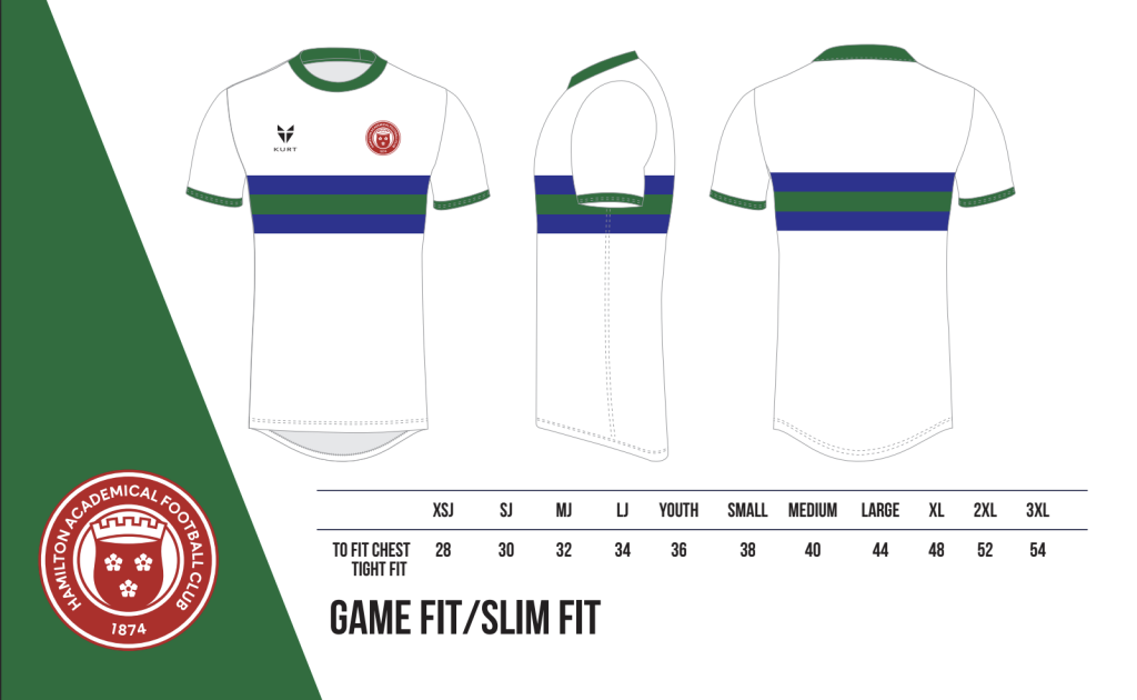 A classic red and white hooped shirt for our Home kit paired with a white Away kit with the original academy colours of green and blue across the chest.
